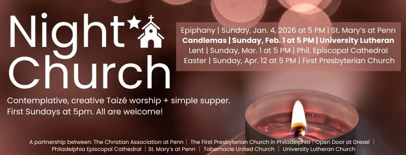 Night Church happens on the first Sunday of the month during the academic year. We hope you can join us for this contemplative, creative Taize service, followed by a simple soup supper.