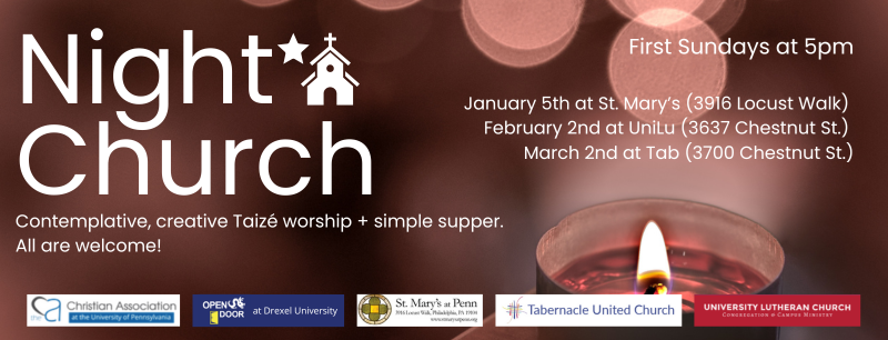 Night Church happens on the first Sunday of the month during the academic year. We hope you can join us for this contemplative, creative Taize service, followed by a simple soup supper.
